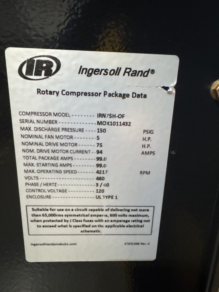 - Lot – 23 – INGERSOLL RAND 75 HP AIR COMPRESSOR